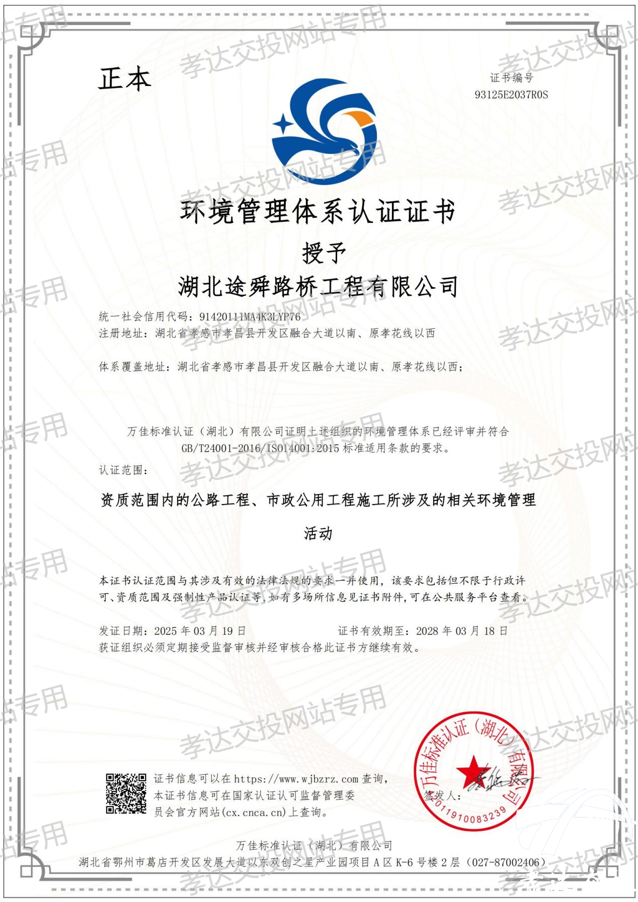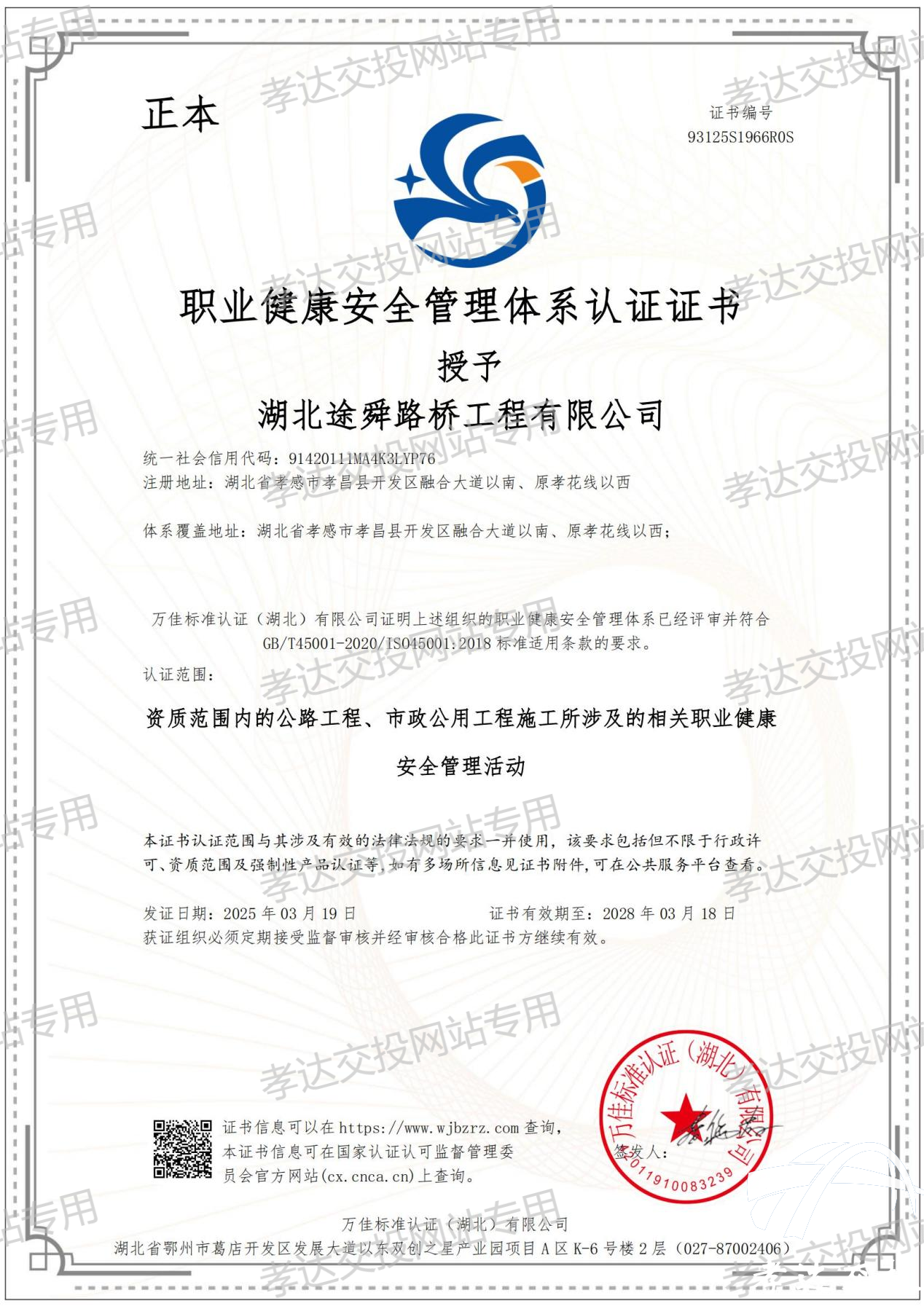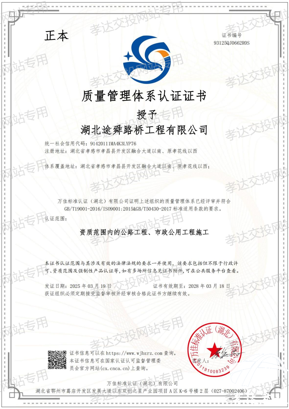 3月19日,孝達(dá)交投全資子公司——湖北途舜路橋工程有限公司,在順利通過(guò)中國(guó)質(zhì)量認(rèn)證中心萬(wàn)佳標(biāo)準(zhǔn)認(rèn)證中心《質(zhì)量、環(huán)境和職業(yè)健康安全管理》三標(biāo)體系認(rèn)證審核后,取得三標(biāo)管理體系認(rèn)證證書(shū)。