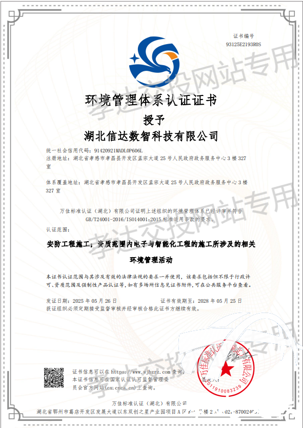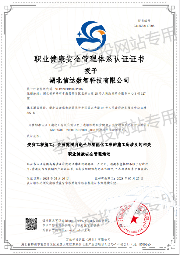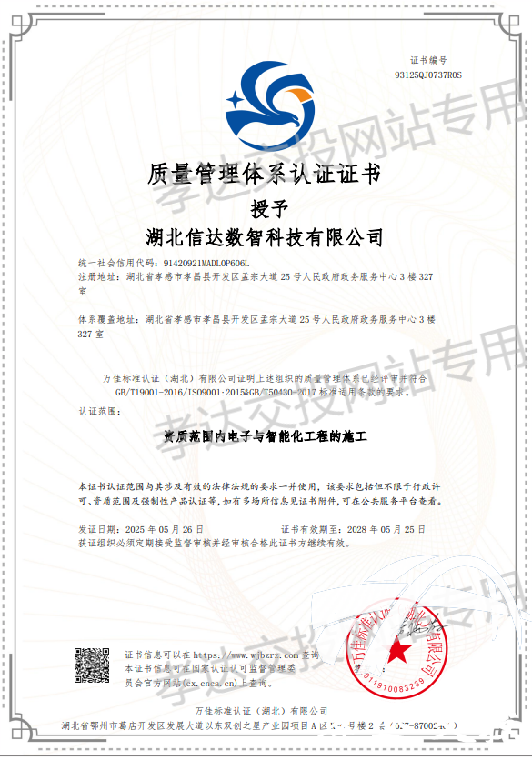 近日,湖北信達數智科技有限公司順利通過管理體系認證,標志著數智公司在標準化、規(guī)范化、精細化管理方面邁上新臺階!